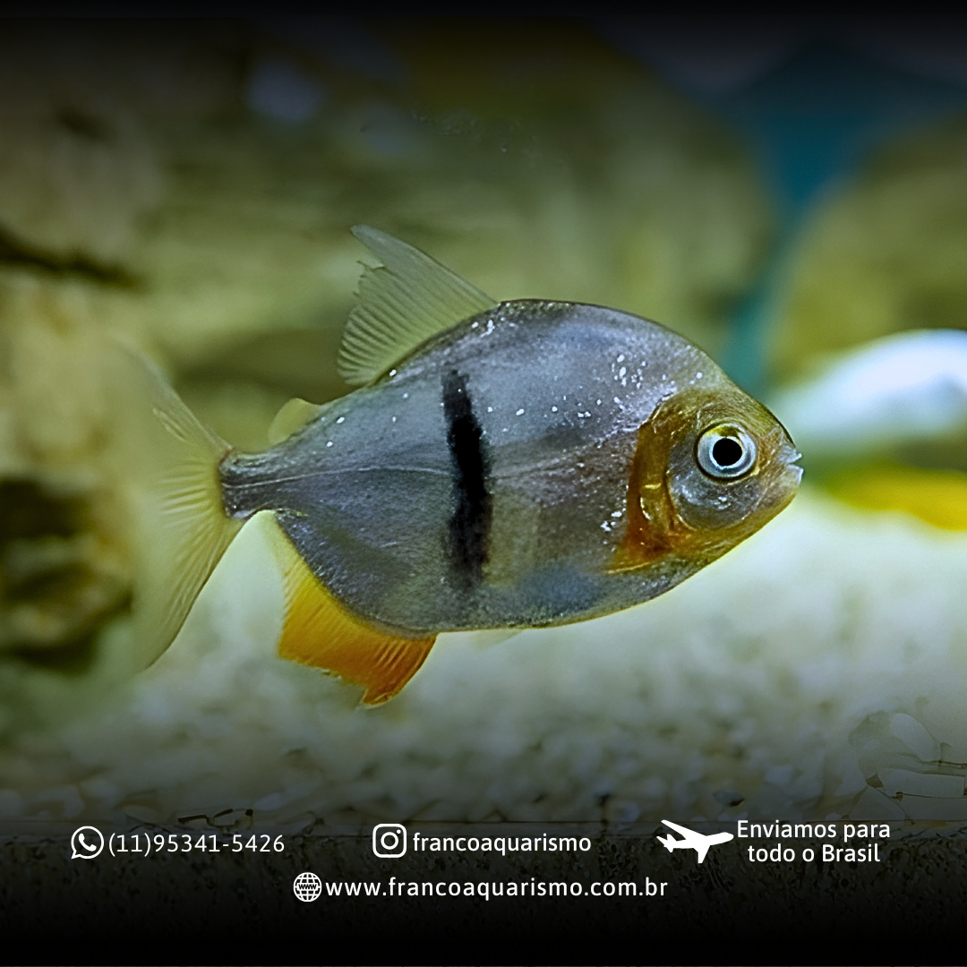 Ele possui um corpo em formato de disco, extremamente comprimido lateralmente e de cor prateada metálica, sua característica mais distintiva é uma barra vertical preta bem definida que atravessa o flanco. Dependendo da procedência, alguns exemplares podem apresentar tons avermelhados na nadadeira anal e manchas alaranjadas próximas à barra preta. É uma escolha excelente para quem busca um peixe de cardume imponente, é recomendado manter grupos de 3 a 5 no aquário para reduzir o estresse.